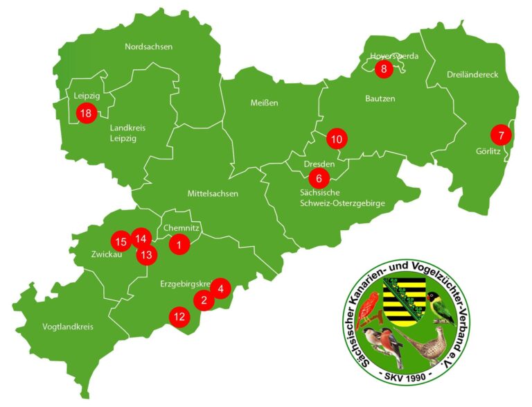 Vereine Die Vereine des SKV 0011. Vogelzüchter und Vogelliebhaber Verein Chemnitz e.V. – gegründet 1955Vors. Eckhardt Frömel, Geschwister-Scholl-Straße 9, 09114 Chemnitz, Tel.: +49 (0)162-1726586, E-Mail 002Züchterverein „Edler Kanarien“ Annaberg e.V. gegr. 1911 Vors. Michael Förster, Hauptstraße 2c, 09481 Elterlein Tel.: +49 (0)37295-90474, E-Mail 004Erzgebirgische Ziergeflügel-, Exoten- und Kanarienzüchter Marienberg und Umgebung e.V. – gegründet 1960Vors. Rüdiger Partzsch, Dorfstraße 18 b, 09496 Marienberg OT LautaTel.: +49 (0)172-3593118; E-Mail 006Dresdner Kanarienzüchter 1880 und Exotenzüchter e.V. – gegründet 1880Vors. Robert Isenberg, Pulsnitztalstraße 63, 01896 Pulsnitz OT OberlichtenauTel.: +49 (0)175-206 7434; E-Mail 007Verein Görlitzer Kanarien- und Exotenzüchter 1914 e.V.Vors. Enrico Klug, Martin-Ephraim-Str. 31, 02343 Görlitz Tel.: +49 (0)176-81780968; E-Mail 008Hoyerswerdaer Vogelzucht- und Vogelliebhaber-Verein – gegründet 2003Vors. Manuel Mietsch, Johannestaler Straße 40, 01996 HosenaTel.: +49 (0)173-7873557; E-Mail 010Radeberger Kanarien- und Exotenzüchterverein e.V. gegründet 1924Vors. Udo Anton, Waldstraße 15, 01454 RadebergTel.: +49 (0)3528-445121; E-Mail 012Ziergeflügel, Exoten und Kanarien Schwarzenberg e.V.Vors. Cornelia Unger, Vogelbeerweg 9, 08315 Lauter-BernsbachTel.: +49 (0)152-53441243; E-Mail 013Verein der Vogelzüchter und -liebhaber Kanaria 1883 Oelsnitz/E. e.V.Vors. Sven Pukat, Puschmannstraße 8, 09394 Hohndorf Tel.: +49 (0)162-2746970; E-Mail 014Verein Ziergeflügel, Exoten und Arterhaltung ThurmKontakt: Gerhard Schulze, Am Winkel 5, 08132 Mülsen Tel.: +49 (0)3760–157304; 015Verein der Vogelliebhaber Waldenburg e.V. – gegründet 1974Vors. Klaus Klepsch, 08412 WerdauTel.: +49 (0)1573 4558845; E-Mail 018 Leipziger Kanarienzüchterverein e.V. gegr. 1879Vors. Marco Reymann, Schlossstraße 11, 04425 TauchaTel.: +49 (0)160-8516007; E-Mail 099Gemeinschaft der Einzelmitglieder im SKVKontakt: Sven Pukat, Puschmannstraße 8, 09394 HohndorfTel.: +49 (0)162-2746970; E-Mail